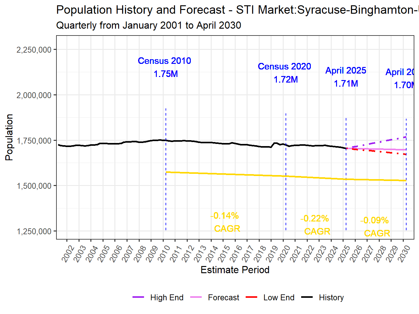 The current population of the Syracuse-Binghamton-Utica-Rome, NY Market is 1,705,075 as of the April 2025 PopStats estimate. PopStat’s Trend models indicate a 5 year population change of -0.5%, resulting in a Population of 1,697,388 by April 2030. This percentage change in Population ranks 145th across STI Markets. The Syracuse-Binghamton-Utica-Rome, NY Market currently ranks 61st in overall population, and will rank 61st by April 2030.