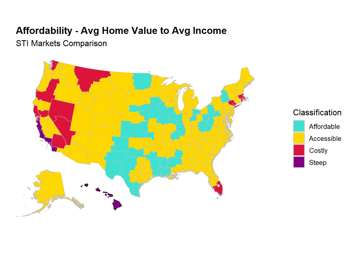 Overall Affordability can be classified in a similar fashion, comparing the Markets Average Home Value with the Average Household Income. This Affordability ratio currently sits at 7.6. The Hawaii, HI Market therefore earns the Steep classification for housing affordability and ranks 4th across STI Markets. The following chart shows how markets compare between these two measure. Note the breaks between affordability classifications are 3, 5, and 7.
